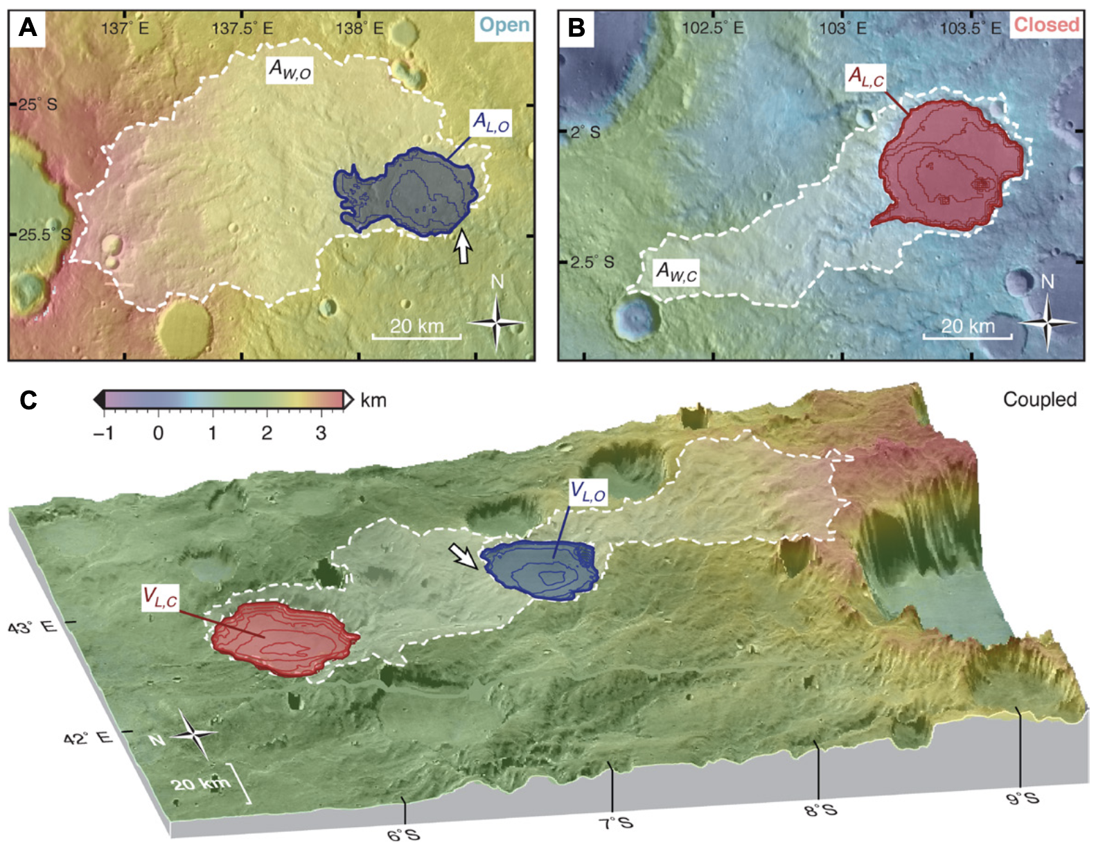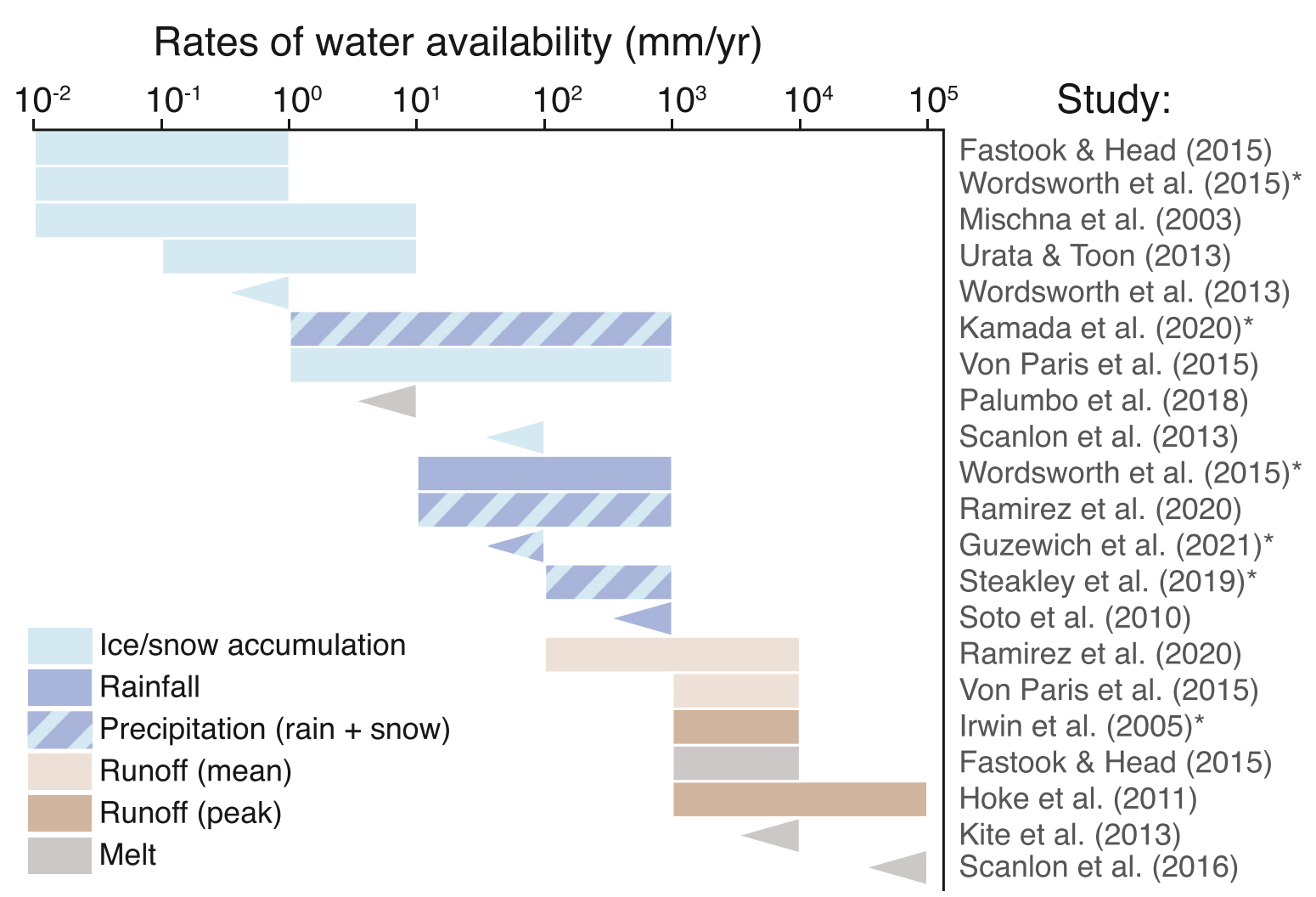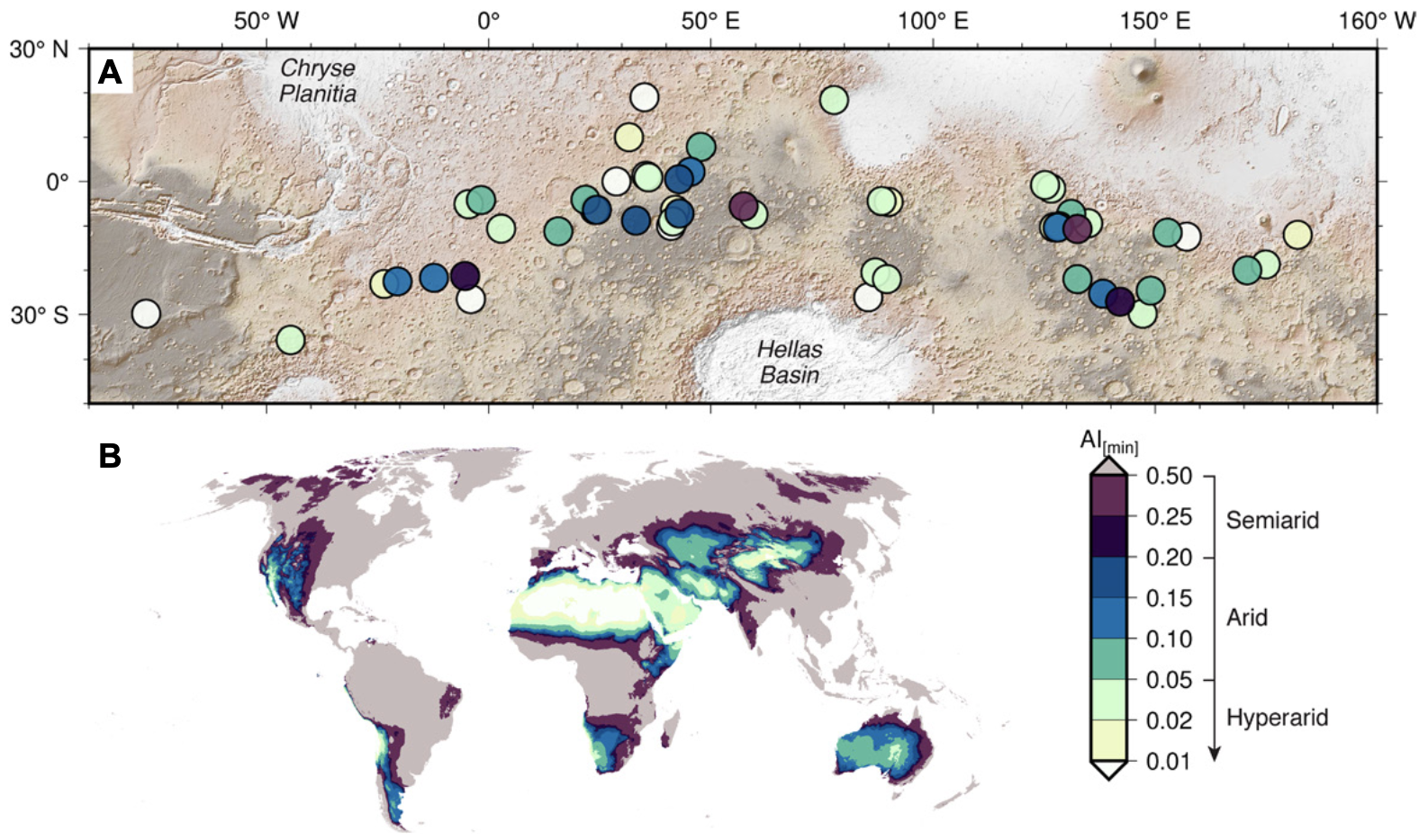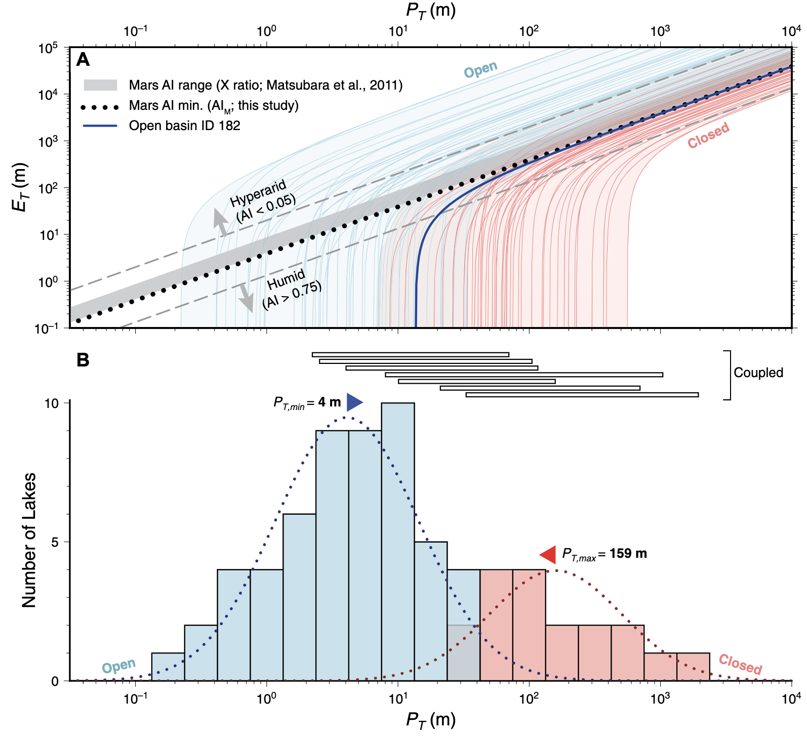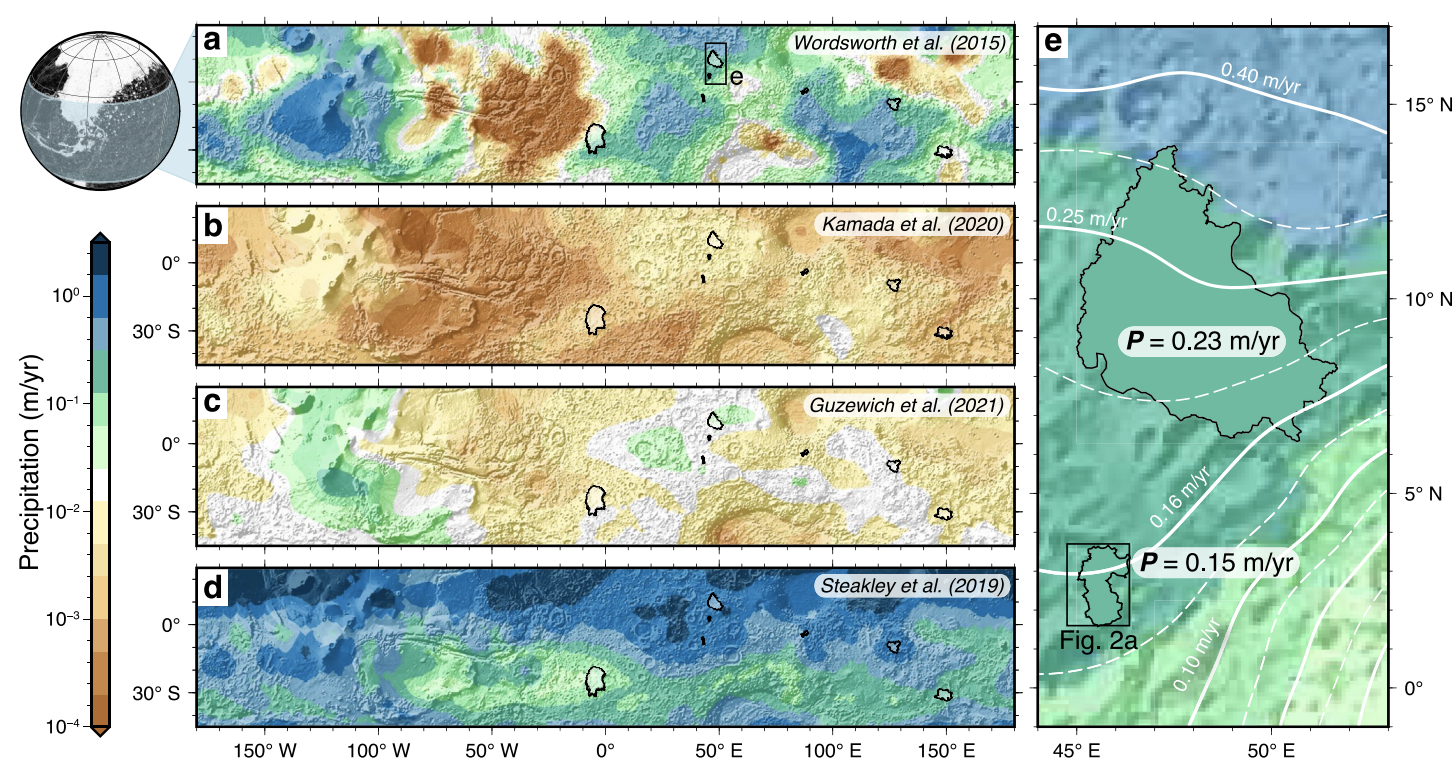 By making use of a database of almost 100 open- and closed-basin lakes on Mars, we show that the basin-averaged precipitation was between 4 and 159 m. Aridities resembled semi-arid locations like the Great Basin, USA, and could have been even more humid! These quantitative results are important as they can be used to test paleoclimate models and figure out Mars’ ancient climate, and provide context for future missions in paleolakes (e.g., Perseverance!).