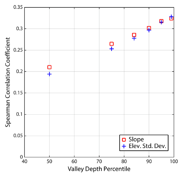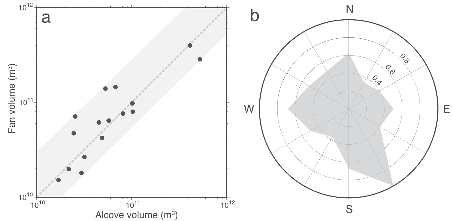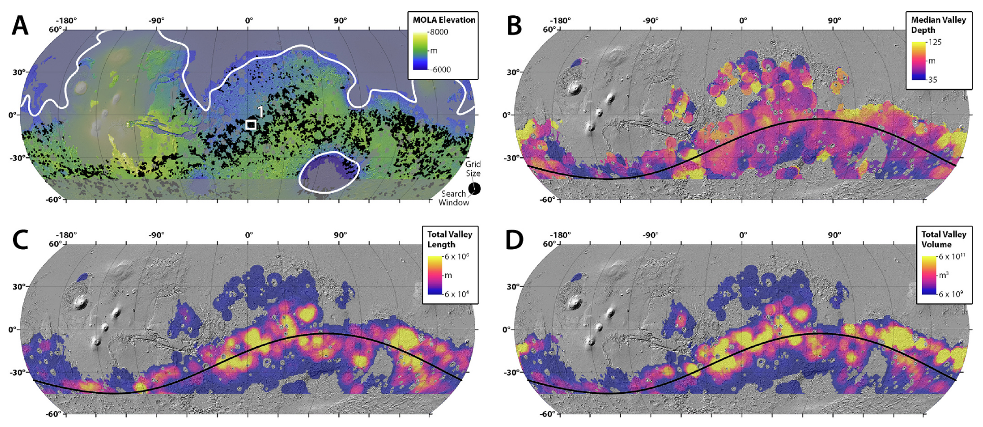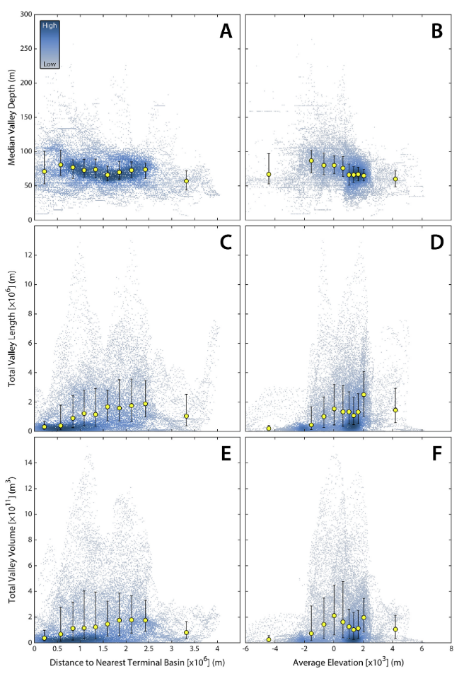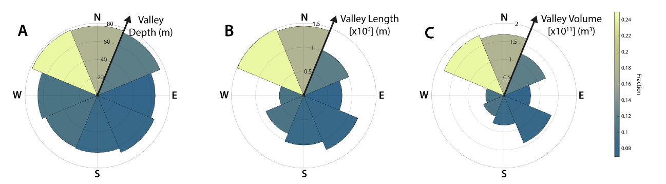 Usually we tend to study valley networks on Mars by looking at the shape of valley networks… However, we now have this neat dataset of global erosion depths, which allows us to understand the geographic distribution of Mars’ hydrologic system in much more detail! Here we find that valley depth depends on regional slope and landscape relief. More suprisingly, there is a peak in eroded volume near a paleo-latitude band — before true polar wander on Mars!