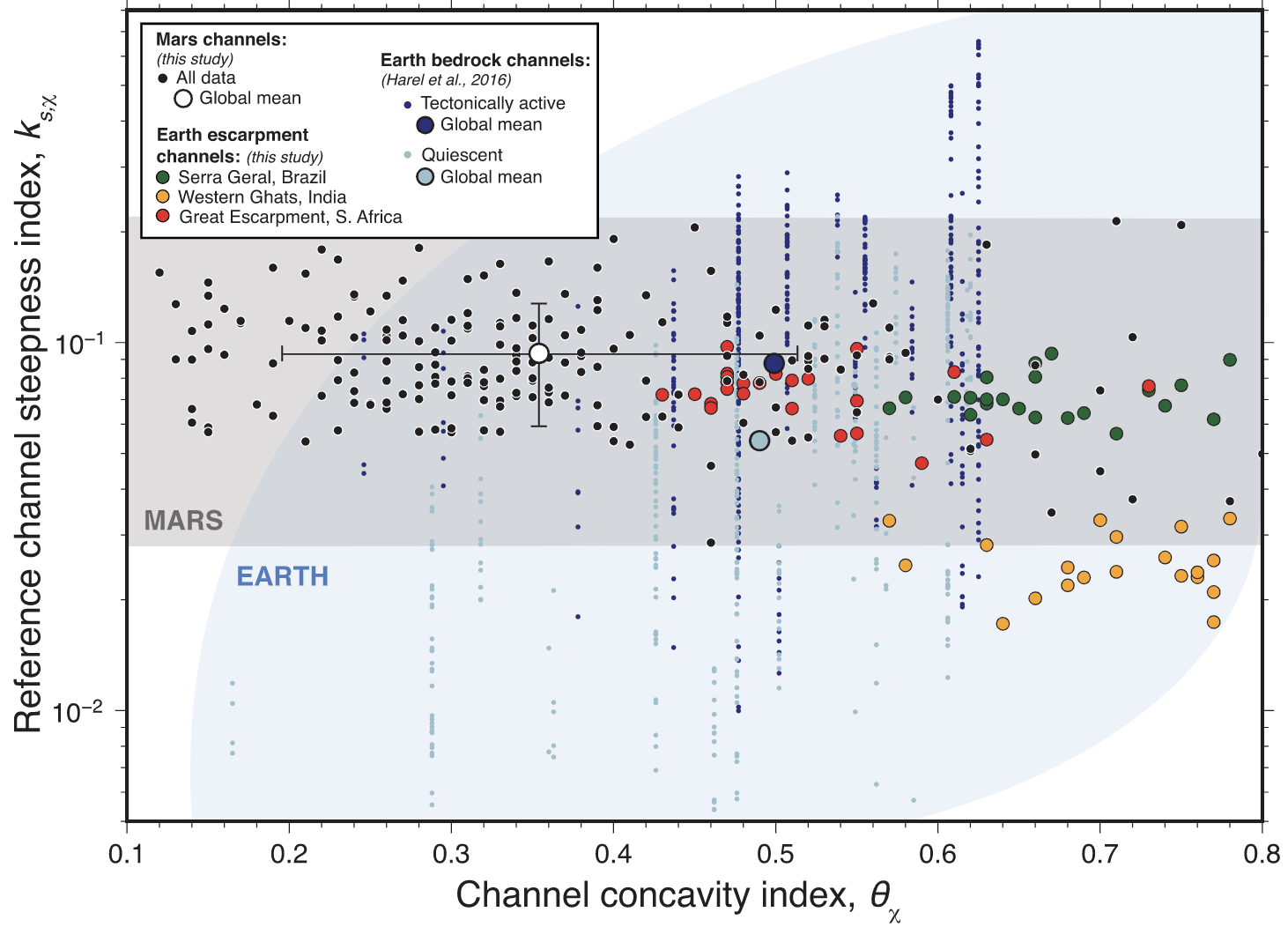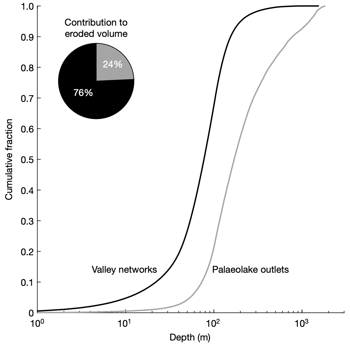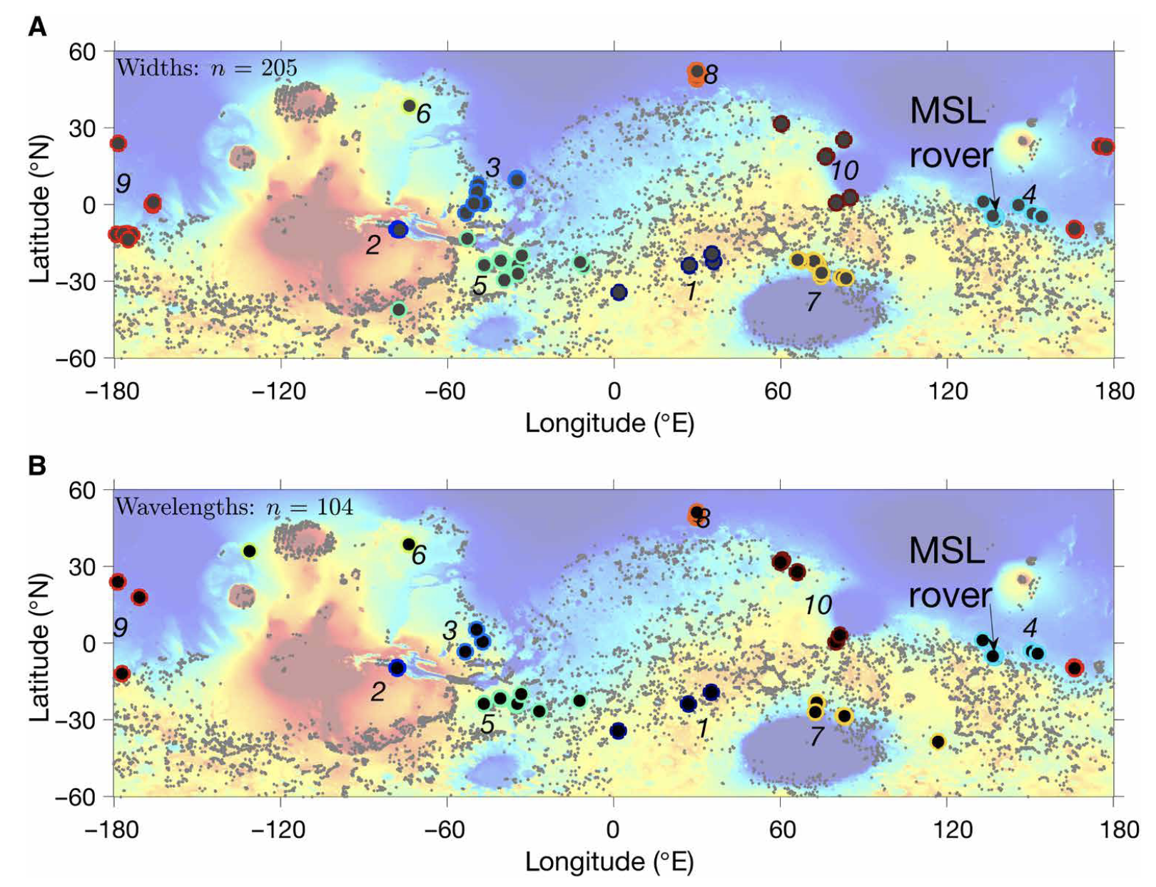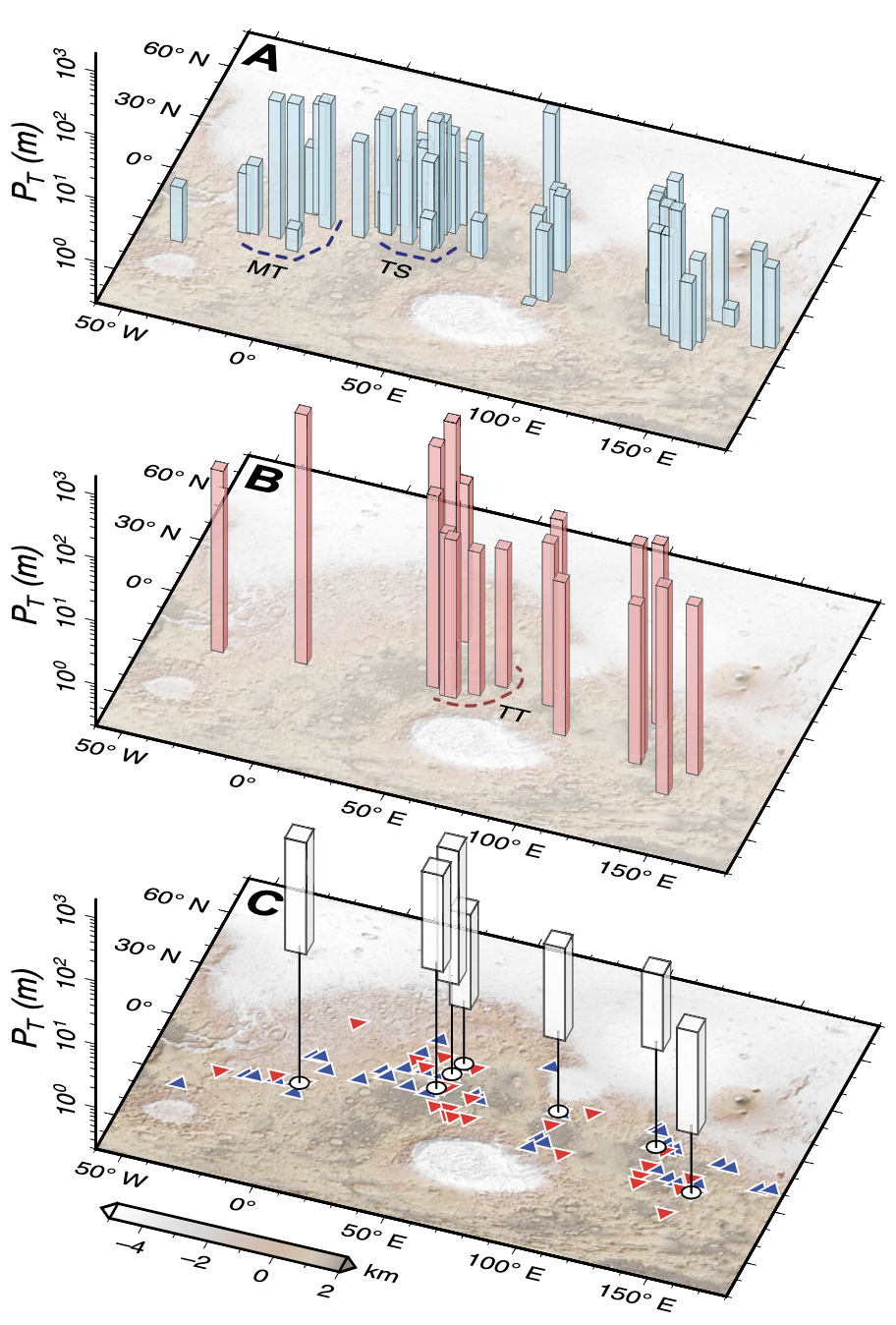 Usually we tend to study valley networks on Mars by looking at the shape of valley networks… However, we now have this neat dataset of global erosion depths, which allows us to understand the geographic distribution of Mars’ hydrologic system in much more detail! Here we find that valley depth depends on regional slope and landscape relief. More suprisingly, there is a peak in eroded volume near a paleo-latitude band — before true polar wander on Mars!