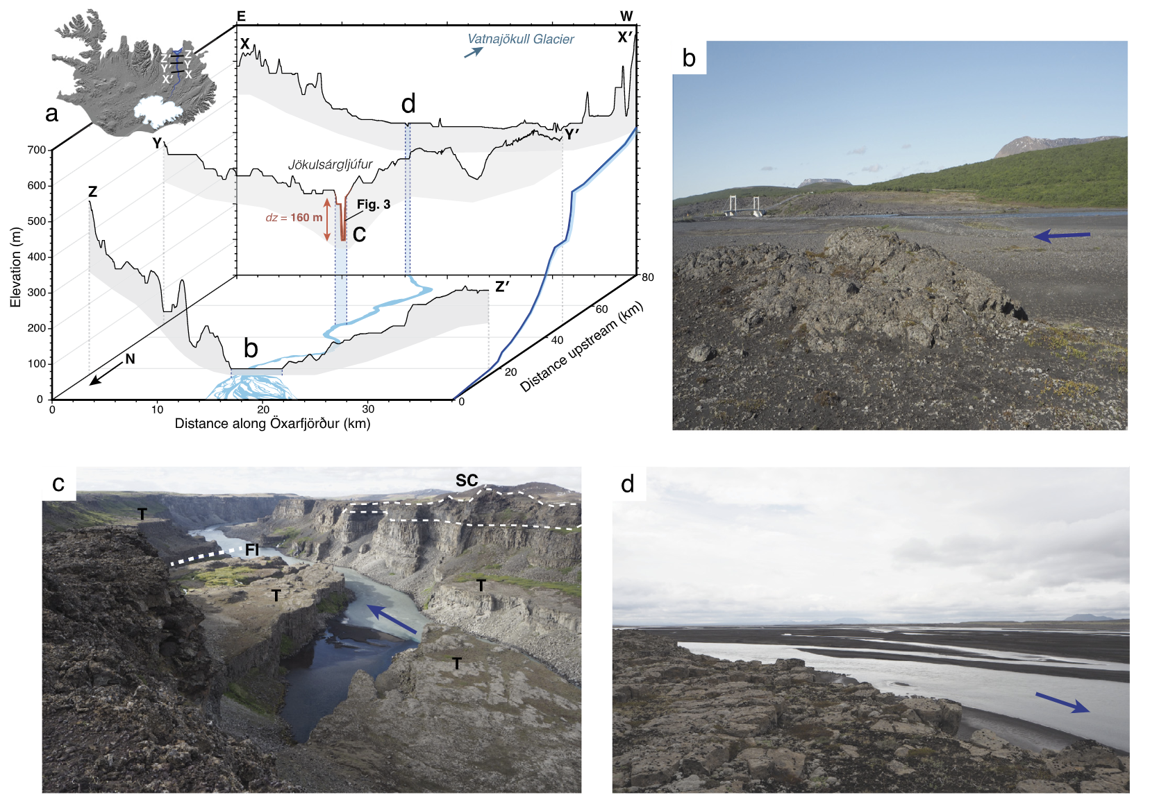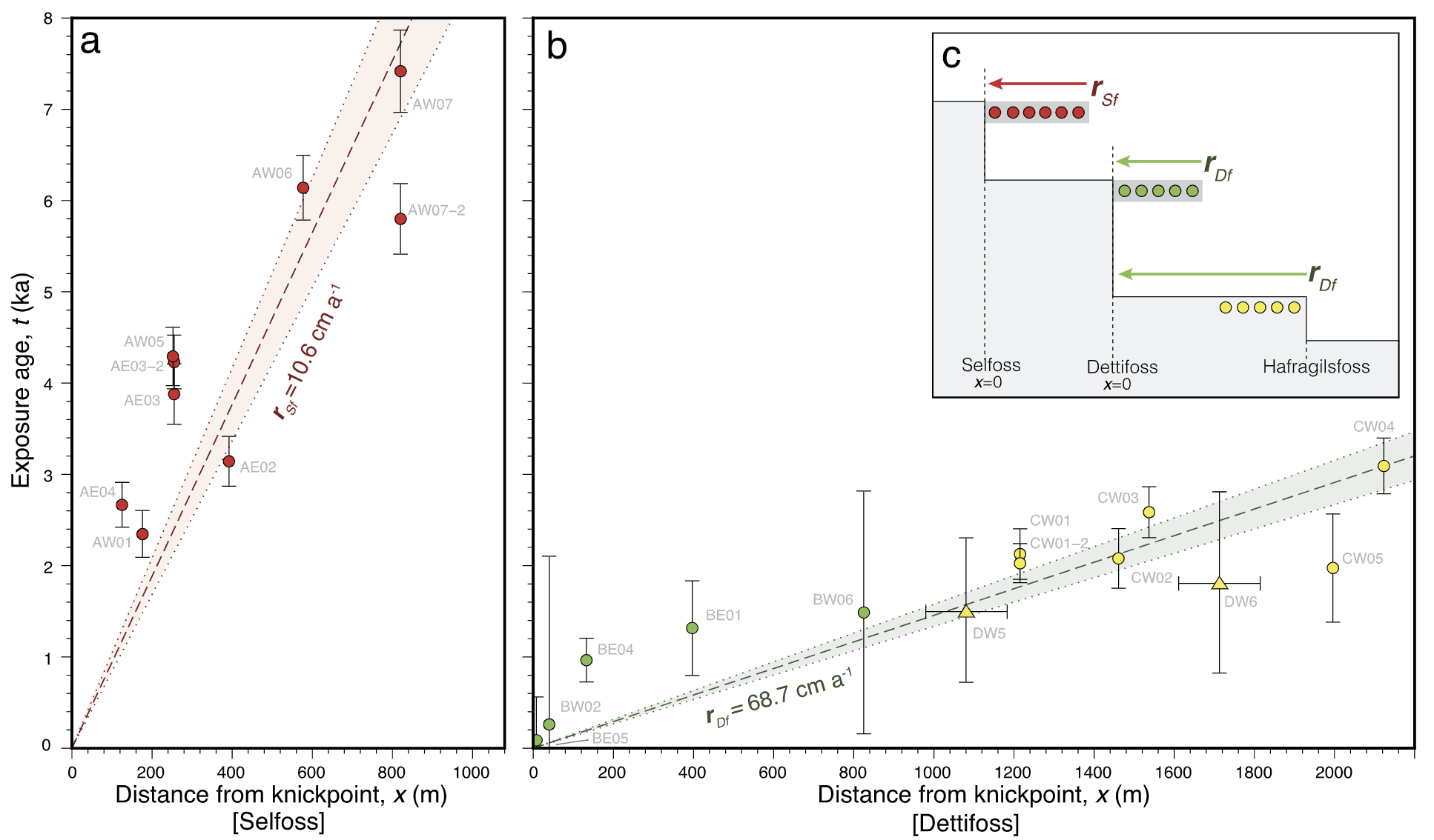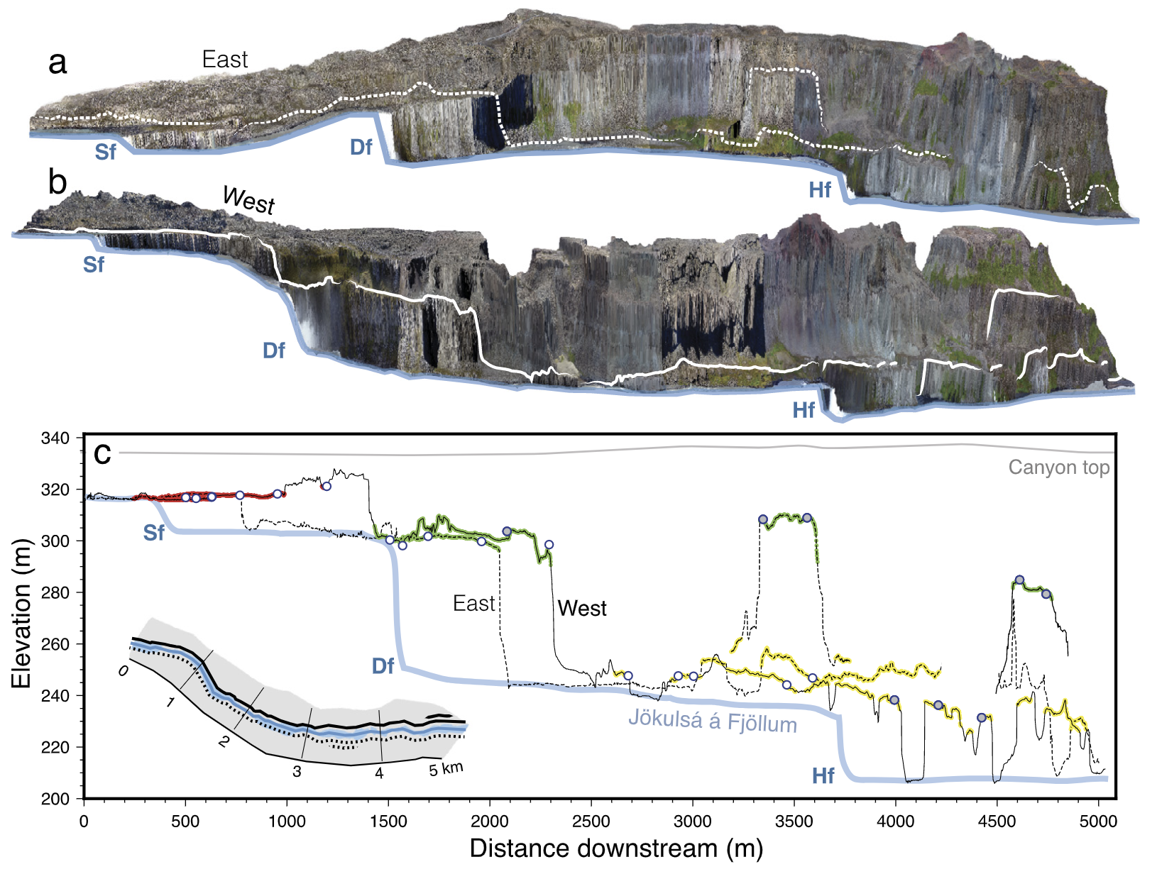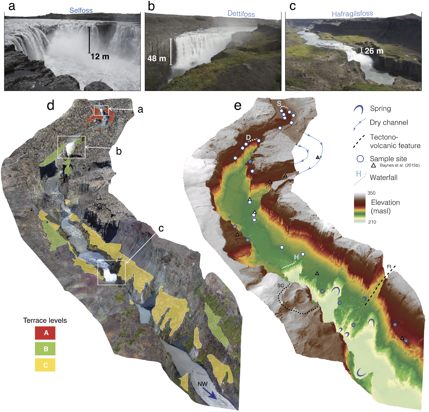 For this project, we went on an expedition to northeastern Iceland. We used drone and geochronological tools (cosmogenic Helium-3) to quantify the erosional history of the second largest waterfall in Europe (Dettifoss, Iceland). Our results suggest the entire canyon that hosts the waterfall complex was formed progressively over several thousands of years, as opposed to only through a few catastrophic events, as previously suggested. Significant uplift and postglacial erosion played a key role in shaping the island, and fluvial erosion generates up to 100 m of relief locally, as shown using our 3D landscape evolution inversion models.