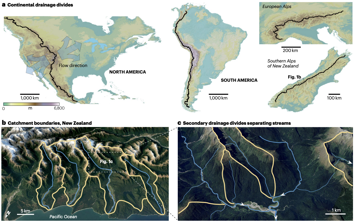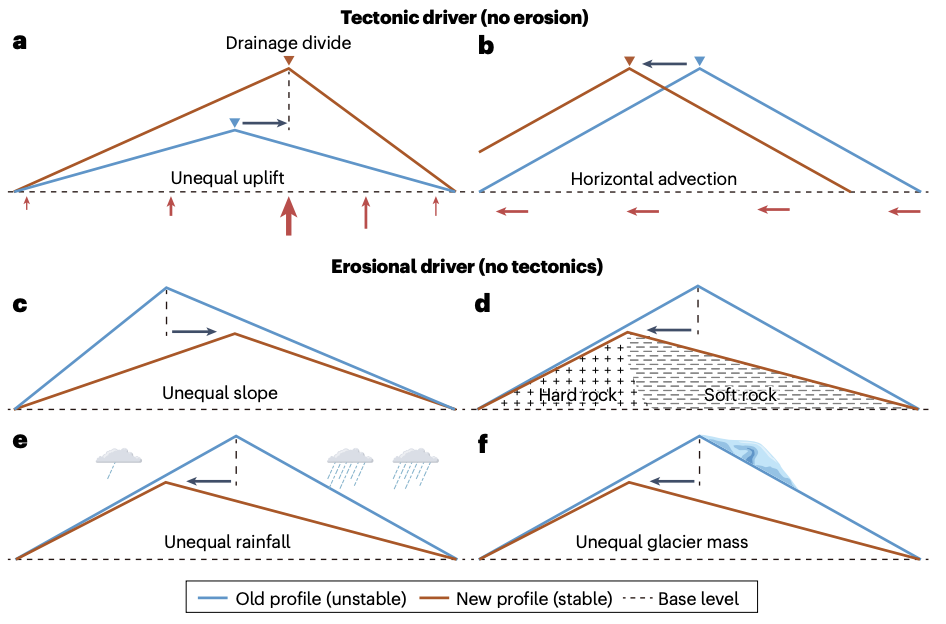 What are drainage divides? These key features are a topographic boundary that separates surface water flow. More importantly, they are dynamic features of our planet’s surface that shape hydrology, sedimentation, carbon cycling, and ultimately, the connectivity of landscapes. Here we break down the main processes that dictate migration (e.g., tectonics vs. climate), the controls and rates, as well as the implications and future perspectives. For example, main drainage divide position of mountains affects spatial patterns